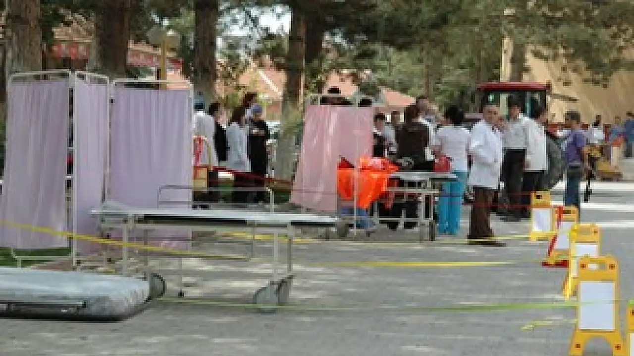 Hastane Afet Programı çerçevesinde afet personelini bilgilendirmek, olaylar karşısında görev ve yetki alanlarını tanıtmak, ayrıca bu tür olaylara karşı hazırlıklı olmaları için tatbikat düzenlendi. Hastane bahçesinde düzenlenen eğitici yangın tatbikatını vatandaşlarda ilgiyle izledi. Temsili olarak yakılan ateş ile başlanan tatbikatta hastane içerisinde bulunan temsili yaralılar personel tarafından dışarıya hızlı bir şekilde taşınarak dışarıda kurulmuş olan hastane kabinlerinde ilk müdahaleleri yapıldı. Hastane içerisinden çıkartılıdan yaralıların acı içinde feryat etmeleri ise yapılan tatbikata renk kattı.