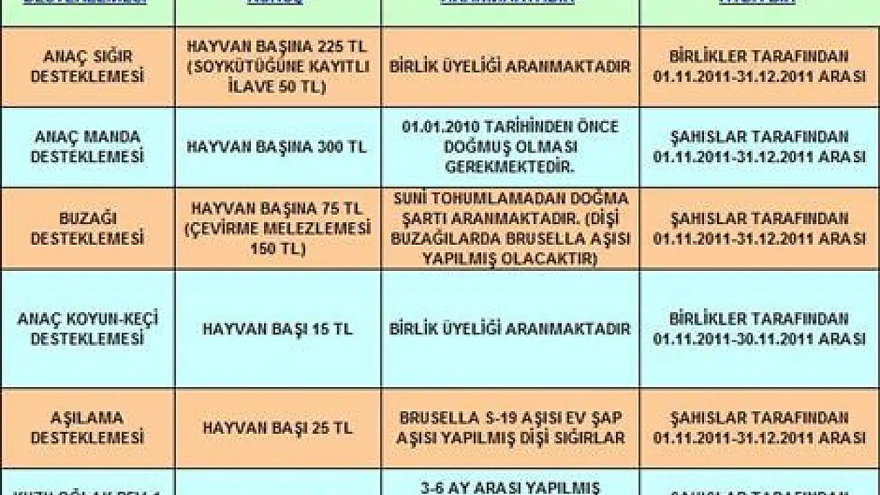Samsun Damızlık Sığır Yetiştiricileri Birliği, Çarşamba Süt Üreticileri Birliği, Samsun Koyun-Keçi Yetiştiricileri Birliği ve mevcut hayvancılık kooperatifleri kendi üyeleri için İlçe Müdürlüğüne toplu olarak dilekçe vermeleri gerektiği öğrenildi. Fakat bu birliklere üye olmayan yetiştiricilerin Anaç Manda Desteklemesi, Suni Tohumlama Buzağısı Desteklemesi, Hayvan Hastalıkları İle Mücadele Desteklemesi (dişi buzağılarına 3-6 aylıkken Brucella S -19 aşısı ve şap aşısı yaptırmak şartıyla), Kuzu-oğlak Rev-1 aşısı desteklemesi için İlçe Tarım Müdürlüğüne 31.12.2011 tarihine kadar şahsen müracaat ederek dilekçe vermeleri gerektiği öğrenildi.