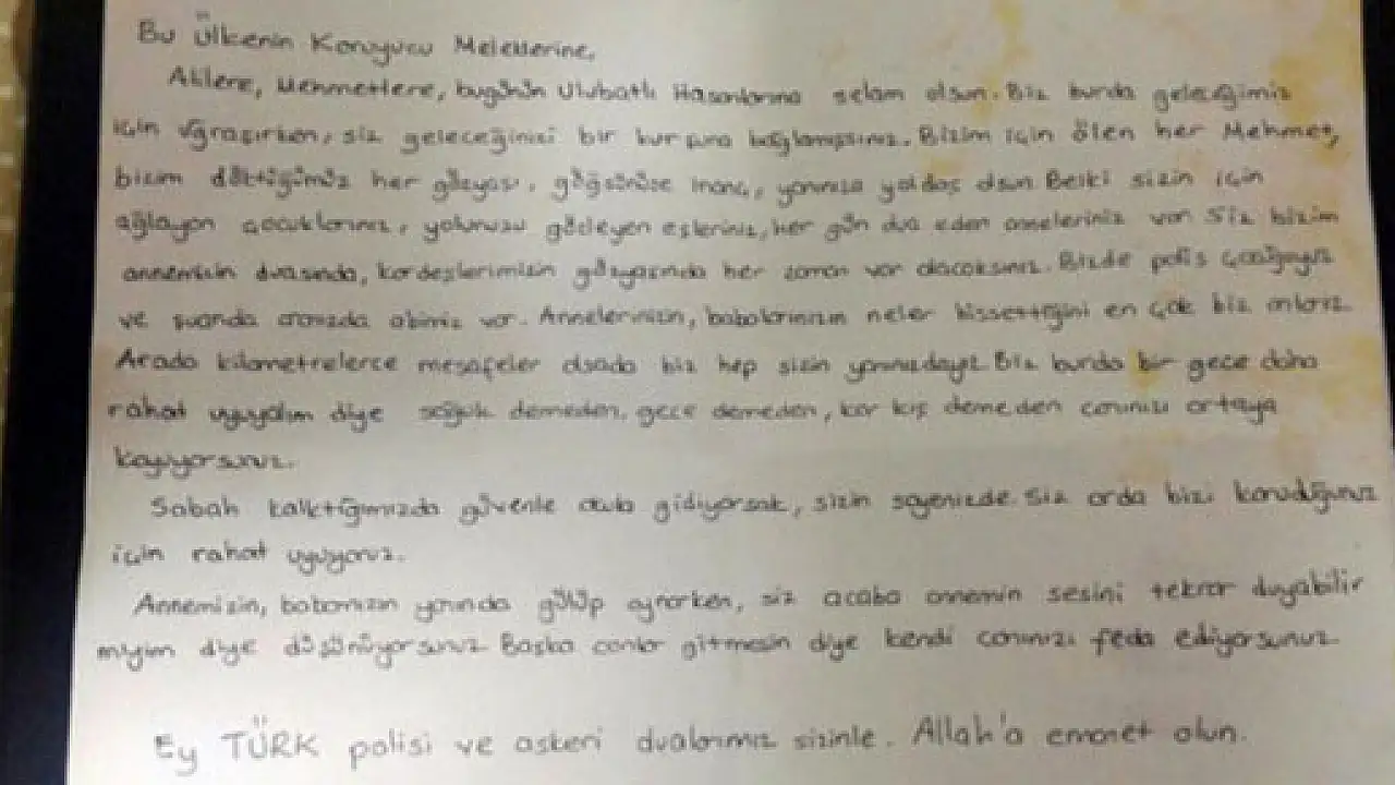 Annelerinizin, babalarınızın neler hissettiğini en çok biz anlarız. Arada kilometrelerce mesafeler olsa da biz hep sizin yanınızdayız. Biz burada bir gece daha rahat uyuyalım diye soğuk demeden, gece demeden, kar kış demeden canınızı ortaya koyuyorsunuz. Sabah kalktığımızda güvenle okula gidiyorsak sizin sayenizde. Siz orda bizi koruduğunuz için rahat uyuyoruz. Annemizin, babamızın yanında gülüp oynarken siz acaba annemin sesini tekrar duyabilir miyim diye düşünüyorsunuz. Başka canlar gitmesin diye kendi canınızı feda ediyorsunuz. Ey Türk polisi ve askeri dualarımız sizinle. Allah’a emanet olun”.