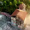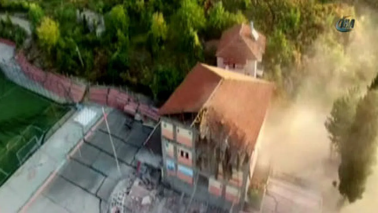 Zonguldak'ın Devrek ilçesinde bir süre önce meydana gelen heyelan sebebiyle zarar gören İmam Hatip Lisesi'nin idari binası büyük bir gürültü ile çöktü. Gökyüzünü kaplayan duman insansız hava aracı tarafından görüntülendi.