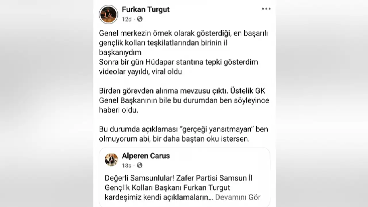 Görevden alınan Başkan Fatih Turgut “Genel merkezin örnek olarak gösterdiği, en başarılı gençlik kolları teşkilatlarından birinin il başkanıydım Sonra bir gün Hüdapar stantına tepki gösterdim videolar yayıldı, viral oldu Birden görevden alınma mevzusu çıktı. Üstelik Genel Başkanının bile bu durumdan ben söyleyince haberi oldu. Bu durumda açıklaması “gerçeği yansıtmayan” ben olmuyorum abi, bir daha baştan oku istersen.”İfadelerini kullandı.