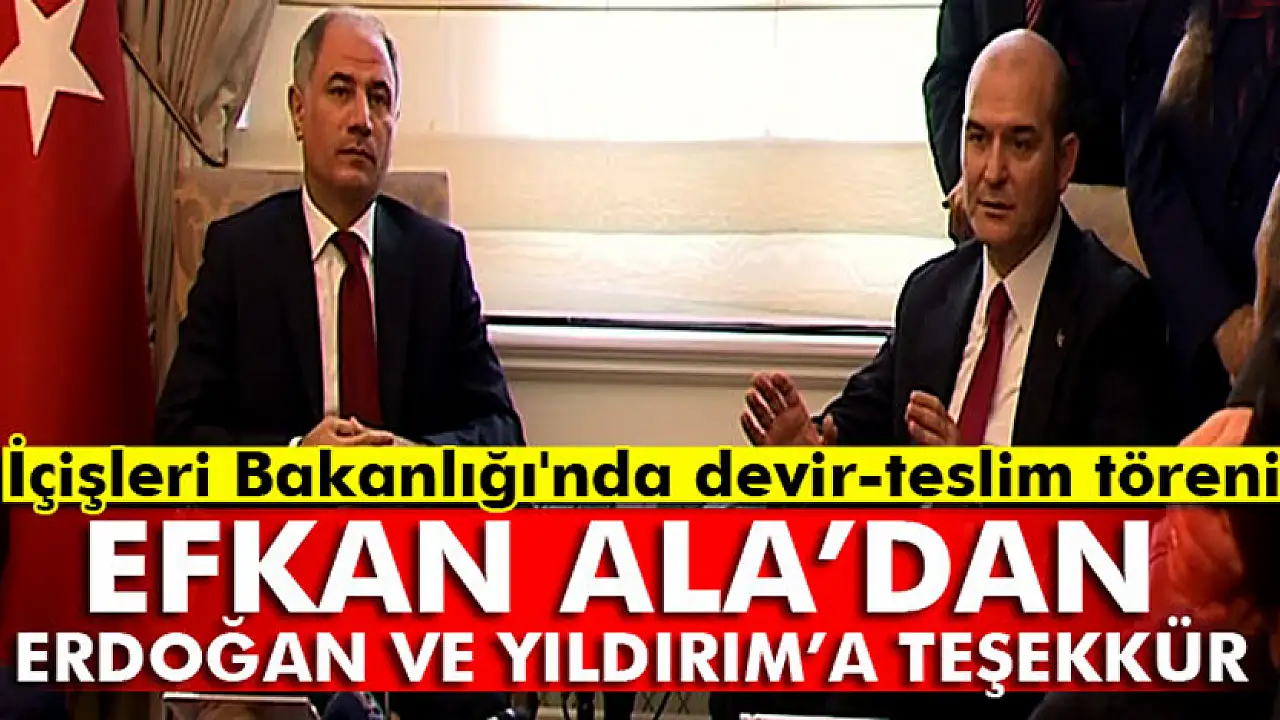 Sözlerine “Bu görevi bana tevdi eden Cumhurbaşkanımıza ve Başbakanımıza teşekkür ediyorum” diyerek başlayan Efkan Ala ise, “Bu görevi yerine getirirken bana her zaman mesaileri ile destek olan birlikte çalıştığımız mesai arkadaşlarıma müteşekkirim. Şehit olan arkadaşlarımız var, gazi olan arkadaşlarımız var. Bütün şehitlerimizi rahmetle anıyorum, gazilerimizi minnetle anıyorum. Şehitlerimizin ailelerine sabırlar diliyorum, yaralılarımıza şifa temenni ediyorum. Bu görevi yerine getirirken her zaman desteğini yanımda hissettiğimiz TBMM’ye ve Meclisimizin milletvekillerine şükranlarımı sunuyorum. Türkiye gibi zaman zaman sistemine kayıt dışı darbecilerin müdahale girişiminde bulunduğu ülkelerde Meclis desteği ve halk desteğinin yanı başımızda hissedilmesi önemlidir. Bu süreç içinde Türkiye’nin çeşitli yerlerine gittiğimizde heyecanları ile yanımızda hissettiğimiz parti teşkilatımıza teşekkür ediyorum. Bunların tamamının içinden çıktığı milletimize feraseti ile her karşılaştığımız zaman bizlere yol gösteren, bu milletin, bu memleketin, ülkenin en kıymetli dayanağı olan ve meydanları kendi iradesine sahip çıkmak için dolduran aziz milletimize müteşekkirim. Sayın Bakanım yeni göreviniz hayırlı olsun. Ülkemize ve milletimize hayırlara vesile olsun. Ülkemizin, milletimizin geleceği için sizin başarılı olmanızı temenni ediyorum. Allah yolunuzu açık etsin. Milletimiz her türlü iyiliğe, başarıya layık bir millettir” diye konuştu.