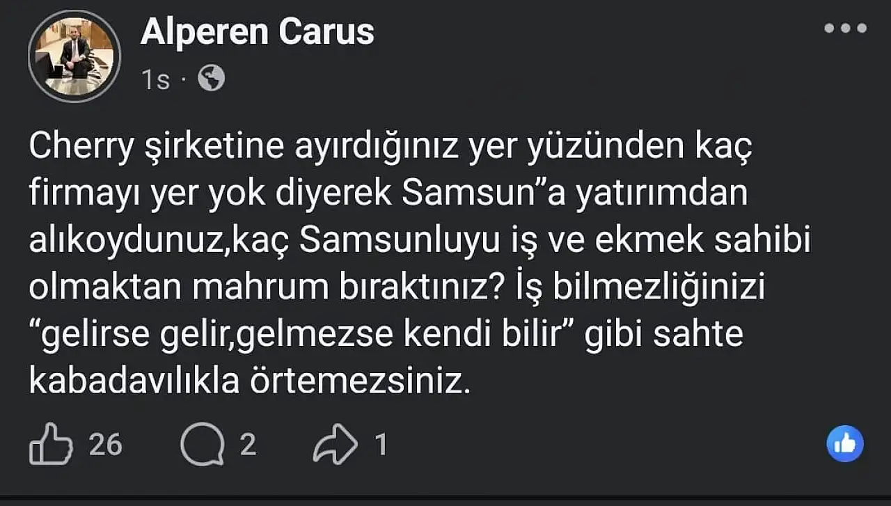 Zafer Partisi Samsun İl Başkanı, sosyal medya hesabından yaptığı açıklamada, yatırım süreçleri ve yer tahsisi konusunda tepkisini dile getirdi. İl Başkanı paylaşımında, “Cherry şirketine ayırdığınız yer yüzünden kaç firmayı yer yok diyerek Samsun’a yatırımdan alıkoydunuz, kaç Samsunluyu iş ve ekmek sahibi olmaktan mahrum bıraktınız?” ifadelerini kullandı.