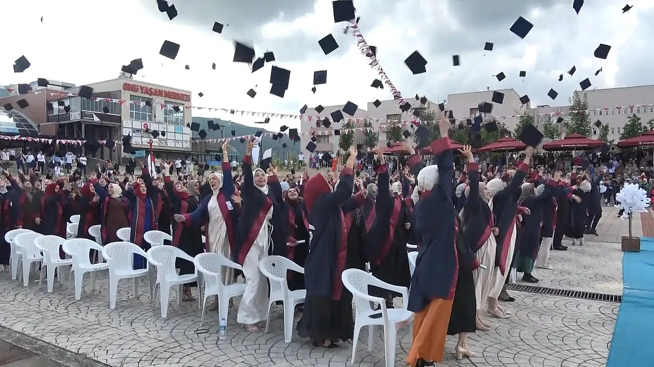 Mezuniyet töreni öğrencilerin diploma alması ve kep atma töreni ile sona erdi.,