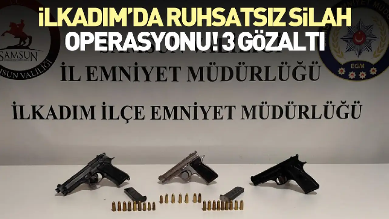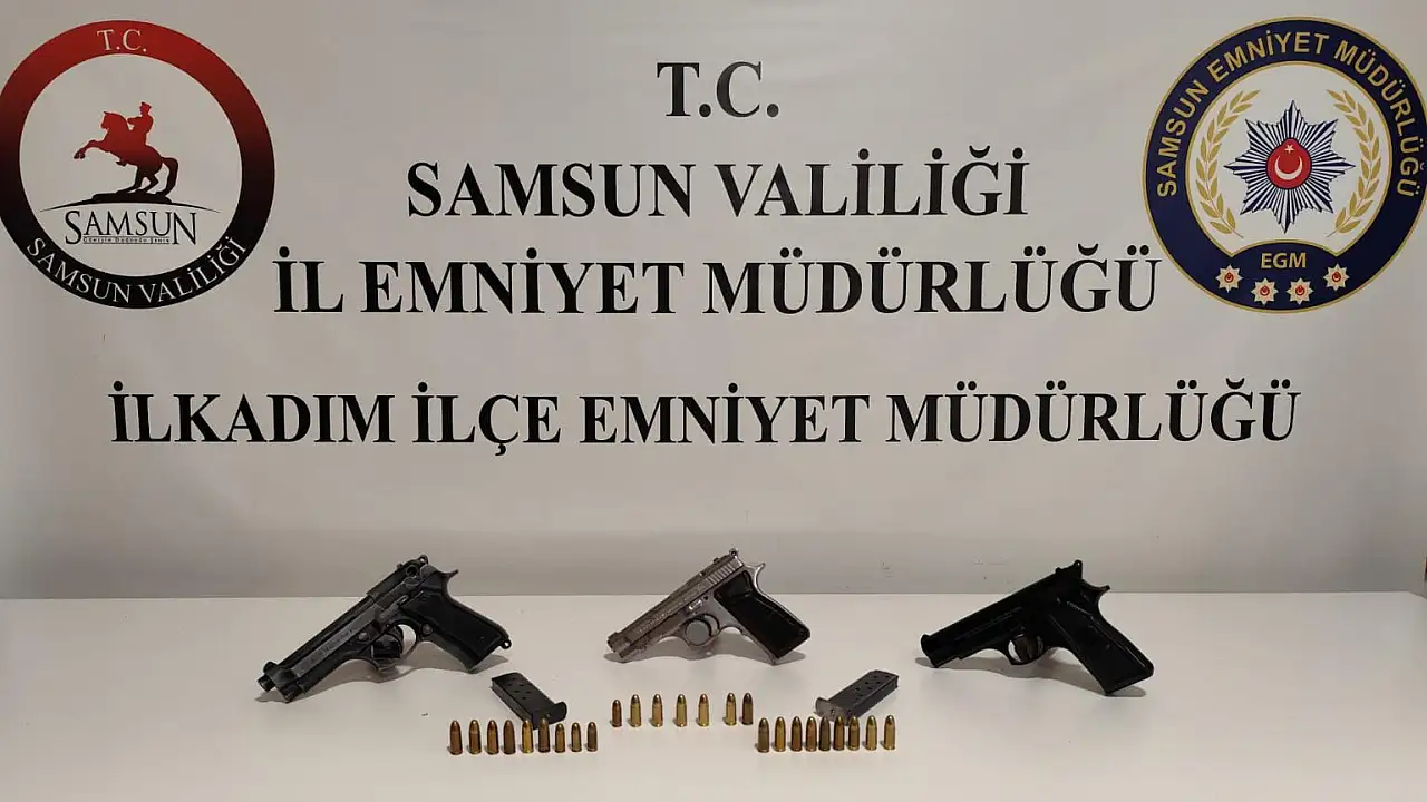 Samsun'un İlkadım İlçesinde düzenlenen operasyonda, 2 ruhsatsız tabanca, 1 kurusıkı tabanca ve 25 fişek ele geçirildi. Olayla ilgili 3 şahıs gözaltına alındı.
