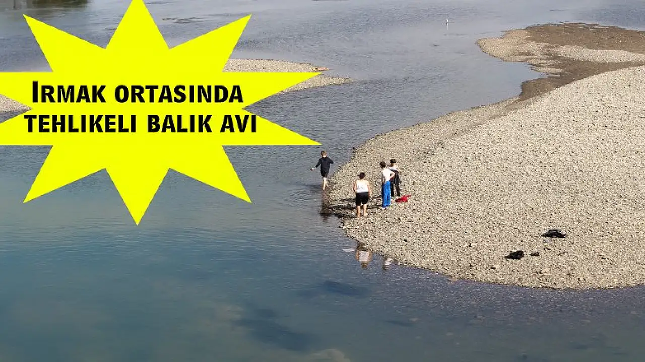Samsun'un Çarşamba ilçesinden geçmekte olan Yeşilırmak Nehri'nin sularının azalmasını fırsat bilen küçük yaştaki çocuklar ırmak ortasında tehlikeli bir şekilde balık tutmaya çalıştı