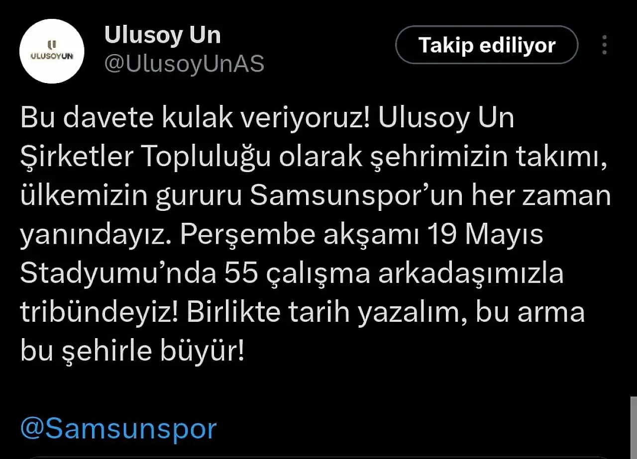 Sosyal medya hesaplarından yaptıkları paylaşımda; “Bu davete kulak veriyoruz! Şehrimizin takımı, ülkemizin gururu Samsunspor’un her zaman yanındayız. Perşembe akşamı 19 Mayıs Stadyumu’nda 55 çalışma arkadaşımızla tribündeyiz! Birlikte tarih yazalım, bu arma bu şehirle büyür!” ifadeleri ile destek verdiler.