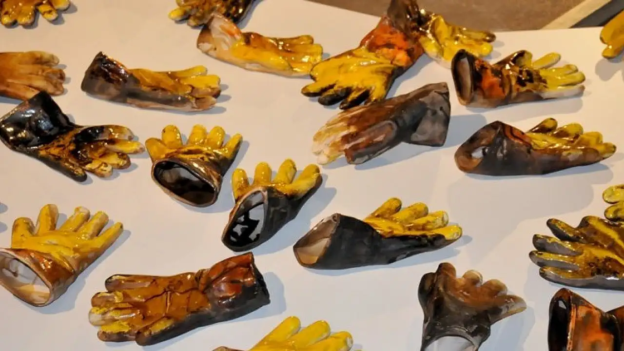 Sesli ve video gösterisi eşliğindeki sergiyi iş sağlığı ve güvenliğine dikkat çekmek için açtığını belirten Yrd. Doç. Dr. Fidan Tonza, “Çalışmamda iş kazalarında artan kayıplara dikkat çekmek istedim. Sergimde iş ve emeği çağrıştıran ses ve görüntü de kullandım. Burada farklı bir düzenleme ile yüzlerce oluşturulmuş seramik iş eldivenleri var. Gelenlerin bu konuya dikkatlerini çektiğimi düşünüyorum” dedi.
