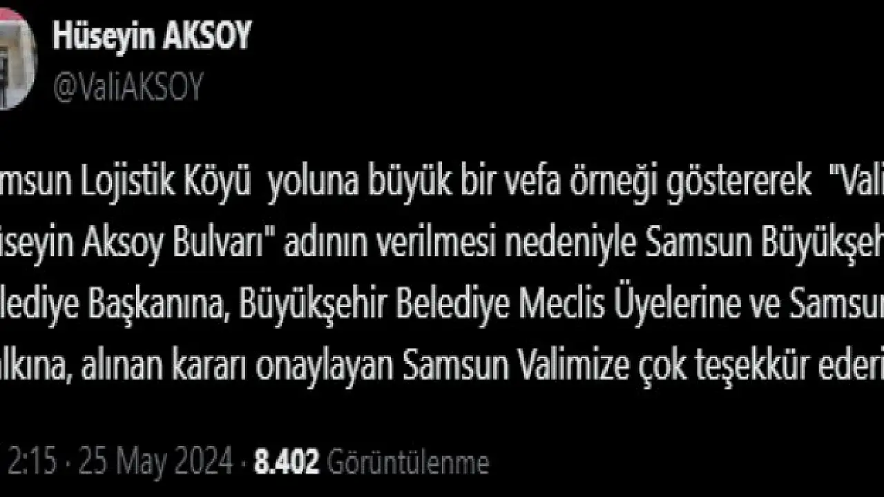 Vali Aksoy, yayımlamış olduğu mesajında, "Samsun Lojistik Köyü yoluna büyük bir vefa örneği göstererek 'Vali Hüseyin Aksoy Bulvarı' adının verilmesi nedeniyle Samsun Büyükşehir Belediye Başkanı'na, Büyükşehir Belediye Meclis üyelerine ve Samsun halkına, alınan kararı onaylayan Samsun Valimize çok teşekkür ederim" ifadelerine yer verdi.