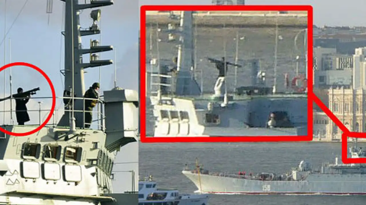 İstanbul Boğazı'ndan geçen Rus donanmasına ait gemideki bir askerin omuzundaki füze dikkat çekti. Rus askerinin provokasyonu olarak yorumlanan olayı fotoğraflayan Boğaz Gözlemcisi Yörük Işık ve Alper Boler, o anları sosyal medyada paylaştı