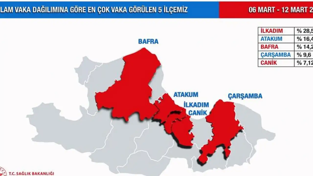 Toplam vaka dağılımına göre en çok vaka görülen 5 ilçe Bafra, Atakum, İlkadım, Canik ve Çarşamba olarak öne çıkarken, 100 binde vaka sayısına göre en çok vaka görülen 5 ilçe ise Bafra, 19 Mayıs, Terme, Asarcık ve Salıpazarı olarak tespit edildi.