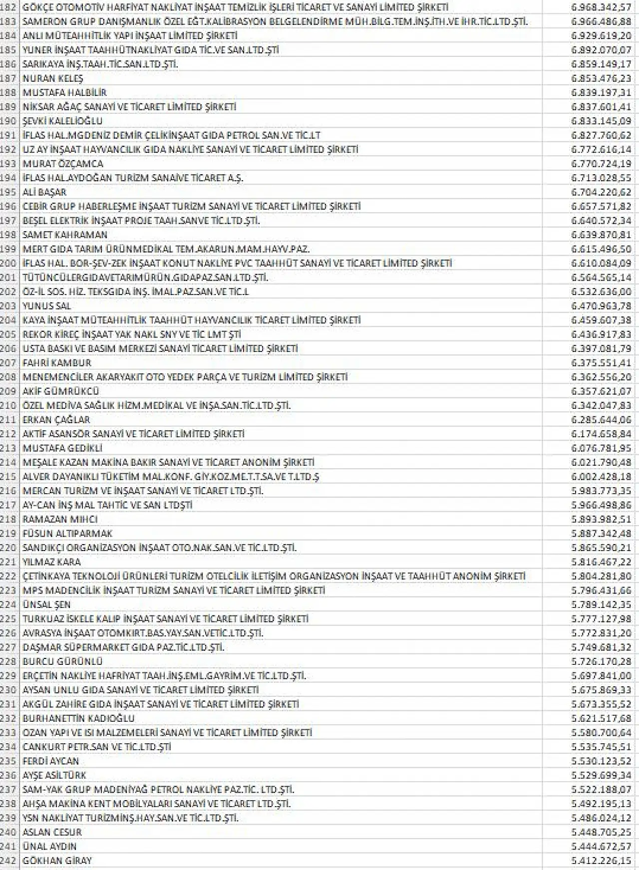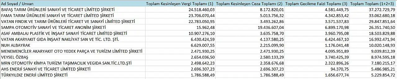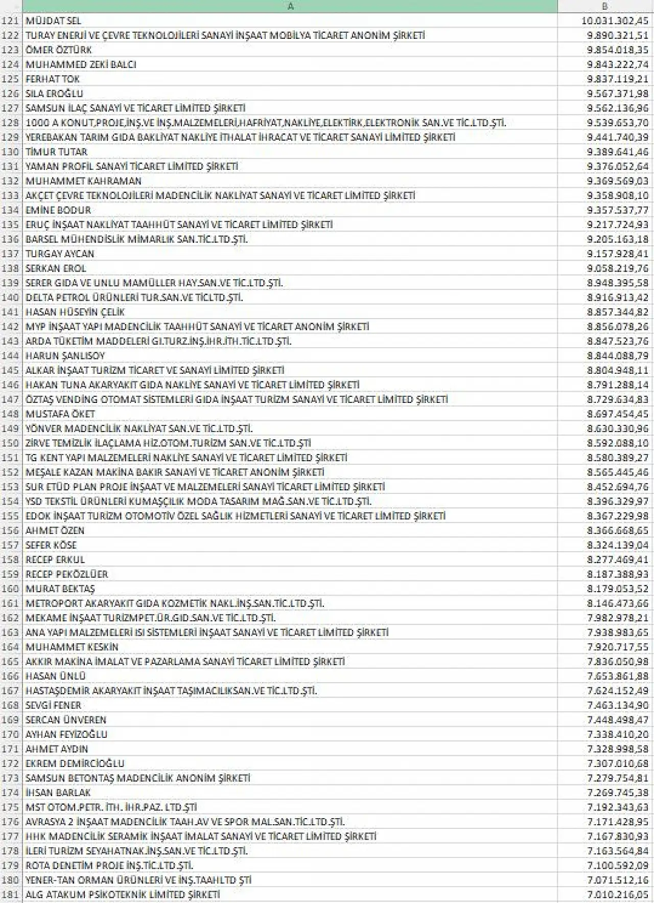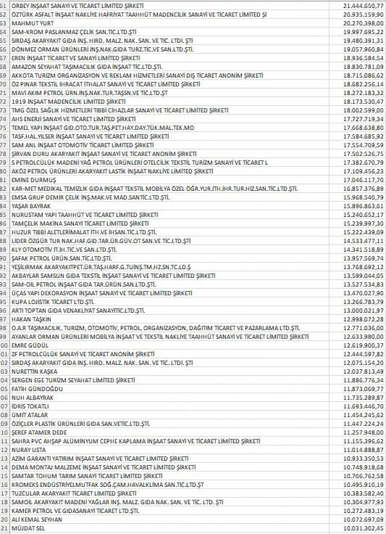 Vergi incelemeleri sonucu cezası kesinleşen 12 şirket ise A listesinde toplam 207 milyon 962 bin 915 TL ile kendine yer buldu.