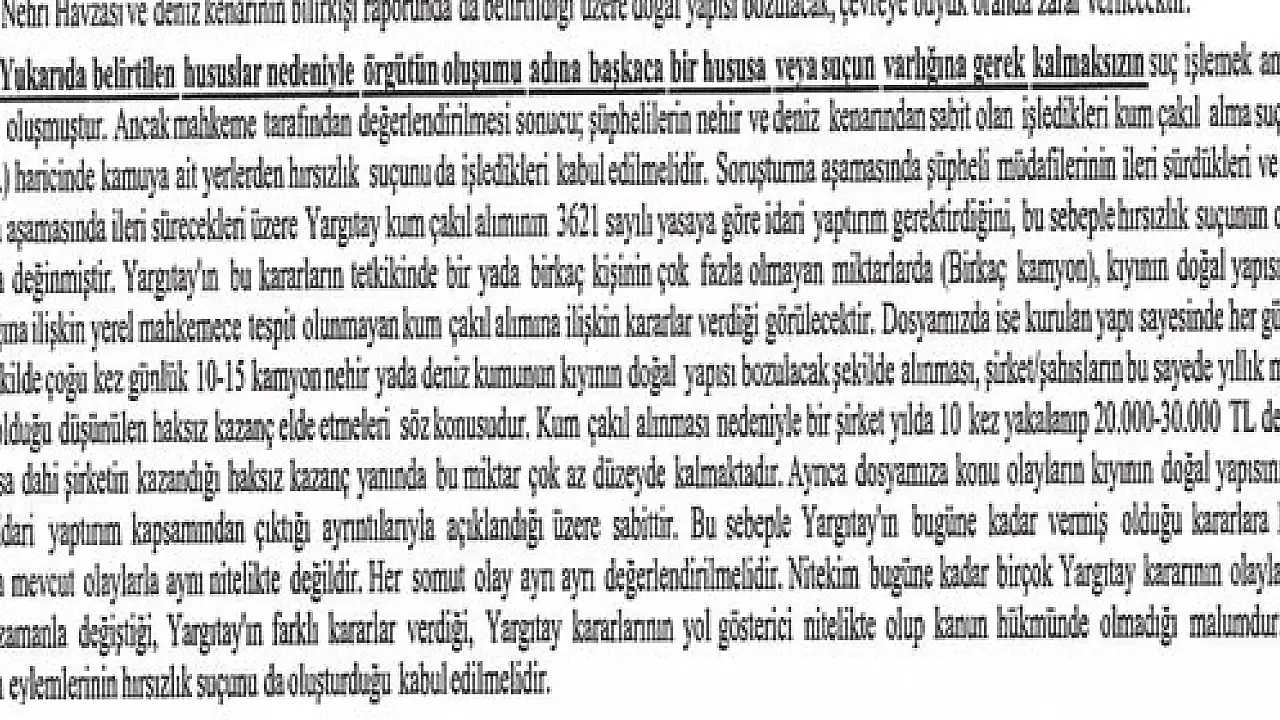 Bu surette şüpheli müdafilerinin 3621 sayılı yasanın 15/4 maddesini görmezlikten gelip suçun oluşmadığı, dolayısıyla örgütten bahsedilemeyeceği iddiası da doğru değildir. Yine Çarşamba ilçe Özel İdaresi Müdürü olan Faruk Toraman'ın 24.12.2012 tarihinde Cumhuriyet Başsavcılığımıza sunmuş olduğu 24.01.2007 tarihli Çarşamba ilçe özel idaresi tarafından hazırlanan altı dönemin Kaymakam'ı Nurettin Yücel imzalı belgede o zamanlar Yeşilırmak Nehri Kenarından kum çakıl alımı ile ilgili çevreye olan zararlar şu şekilde gösterilmiştir: '...D.S.İ. Bölge Müdürlüğü'nün 25.08.2003 gün ve 9083 sayılı yazısında Kumköy regülatörü mansabında kalan nehir yatağında taveg kot düşüklüğünün minimum 1.40 maksimum 3.15 olduğu bunun şedde şevlerinde oyulmaya neden olduğu Regülatörün ve Suat Uğurlu Barajı'nın stabilize güvenliğini riske soktuğu bildirilmektedir. Bölgedeki kum çakıl ocaklarının uzun yıllar ruhsatsız ve kaçak çalıştıklarının bilinmesine rağmen bunlara müteaddit defalar stok malzemelerin satışı için izin verilmiş, bu izin şekli daha sonra elek üstü malzemenin nakline dönüştürülmüştür. D.S.I Bölge Müdürlüğü'nün oluşturulan özel komisyonların Kaymakamlığımızın bu konudaki tüm tespit ve uyarılarına rağmen şu veya bu şekilde malzeme nakline izin verilmesi Yeşilırmak Nehri ve çevresinde büyük bir doğa ve çevre katliamına neden olmuştur. Yeşilırmak Nehri'nin iki yanındaki şeddeler yıpranmış, zayıflamış ve ağır bir feyezanı kaldıramaz hale gelmiştir. Seddelerin tam kenarına kadar yapılan kum çakıl talanı sonucu oyulmuştur. Sedde kenarından itibaren büyük gölcükler oluşmuştur. Yapılacak olan eğer hala kalmışsa stok malzeme, elek üstü malzeme yığıntılarının sedde kenarına doldurularak seddelerin az da olsa sağlamlaştırılması olmalıdır.'