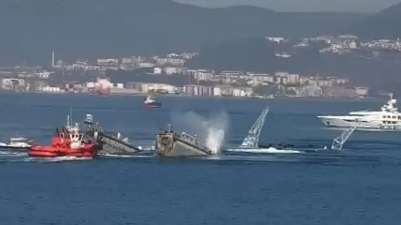 Kocaeli'de Yachtley Tersanesi'ne ait yüzer havuzun battığı anlar kameraya yansıdı. Yüzer havuzda bulunanların denize atladığı görüldü.