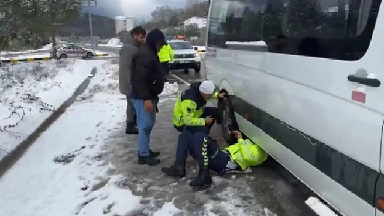 Alınan bilgiye göre Bartın'da etkili olan kar yağışının ardından polis, jandarma, karayolları ekipleri alarma geçti. Ekipler sorumluluk bölgelerinde yolda kalan araçların yardımına yetişiyor. Bartın'ın Amasra ilçesine bağlı Makaracı ve İnpiri köylerinden yolcu taşıyan bir minibüs sürücüsü, yoldaki kar nedeniyle aracına zincir taktı. Karlı bölgeyi geçtikten sonra zinciri çıkarmak isteyen minibüs şoförü, diğer sürücü ve yolcuların yardımıyla yaklaşık 45 dakika zinciri çıkarmak için uğraştı. Tüm çabalarına rağmen sıkışan zinciri çıkaramayan sürücünün yardımına, bölgede devriye gezen jandarma ve polis ekipleri yetişti.