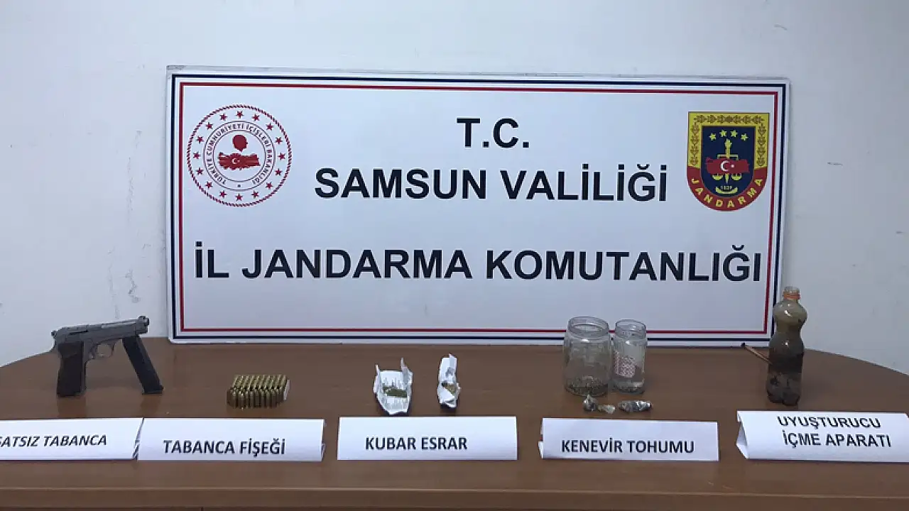 Jandarma KOM Şube Müdürlüğü ekipleri, Atakum ilçesi Özören Mahallesi'nde ise O.Y. ve A.A.'nın ev ve eklentilerinde yaptığı aramada 9 gram kubar esrar, 53 gram kenevir tohumu, 1 adet 9 mm çapında ruhsatsız tabanca, 78 adet 9 mm çapında fişek, ve 1 adet uyuşturucu kullanma aparatı ele geçirdi.