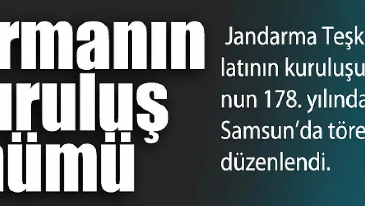 Jandarma Genel Komutanlığının 178. yılı kutlamaları nedeniyle Samsun’da Atatürk Anıtı’nda tören yapıldı. Anıta çelenk sunumu ile başlayan tören, saygı duruşunda bulunulması ve İstiklal Marşı’nın okunmasıyla son buldu. Kutlama törenine Samsun İl Jandarma Komutanı J. Kıd. Alb. Ünsal Ağaoğlu ve askeri erkan katıldı.