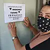 Samsun'da kadın muhtar Filiz Kavalcı, korona virüse karşı vatandaşları maske takması için uyarmak amacıyla ev ve iş yerlerinin kapılarına broşürü asıyor.