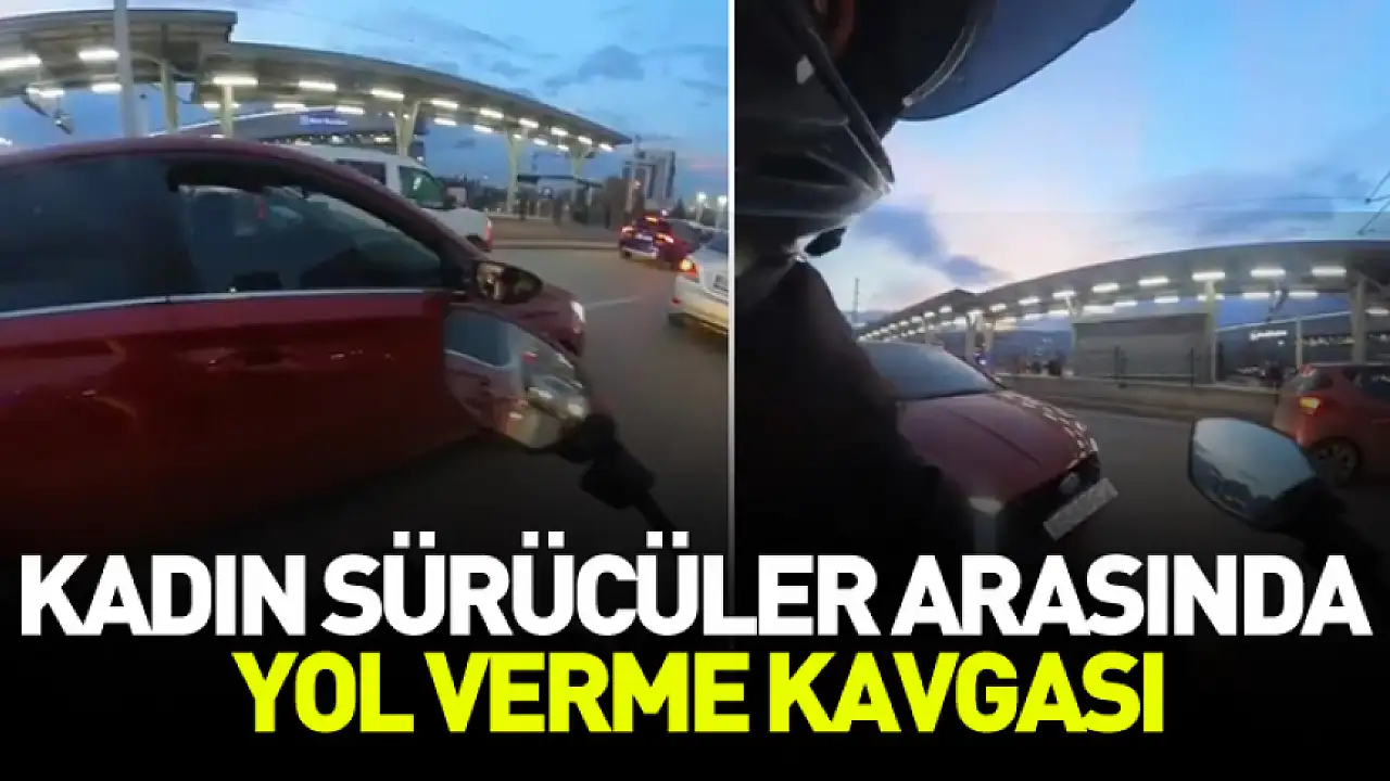 Bursa'da kadın motosiklet sürücüsü ile kadın otomobil sürücüsü arasında yol verme nedeniyle başlayan sözlü tartışma, kısa sürede büyüyerek kavgaya dönüştü. Yaşanan arbede sırasında otomobil sürücüsü motosikletliye çarparken, motosiklet sürücüsü ise öfkesine hakim olamayarak aracın aynasına vurdu. Olay anı kask kamerasına yansıdı.