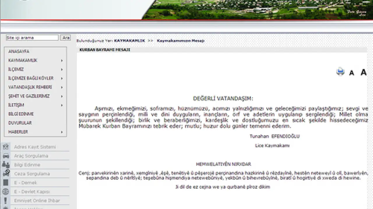Kaymakam Efendioğlu Türkçe ve Kürtçe verdiği bayram mesajında, 'Aşımızı, ekmeğimizi, soframızı, hüznümüzü, acımızı yalnızlığımızı ve geleceğimizi paylaştığımız, sevgi ve saygının perçinlendiği, milli ve dini duyguların, inançların, örf ve adetlerin uygulanıp sergilendiği, millet olma şuurunun şekillendiği; birlik ve beraberliğimizi, kardeşlik ve dostluğumuzu en sıcak şekilde hissedeceğimiz Mübarek Kurban Bayramınızı tebrik eder; mutlu, huzur dolu günler temenni ederim.' dedi. Kutlama metninin Kürtçesi ise aynı sayfada Türkçe metnin altında yer aldı.