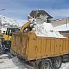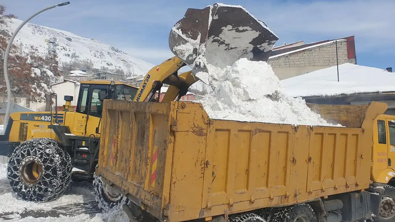 Son yılların en çok kar yağışının ardından Van'ın Başkale ilçesinde bir metreyi geçen kar kalınlığı ile birlikte başlatılan çalışmalar sonucunda kar yığınları kamyonlarla yerleşim yerinin dışına taşınıyor.