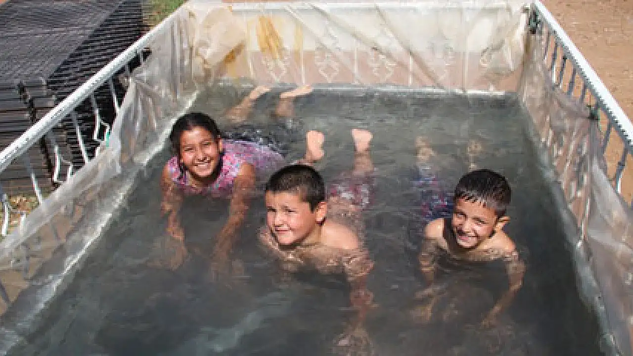 Fethiye’nin Esenköy Mahallesi’nde esnaflık yapan Ömer Boyacı kendisine ait kamyonet kasasının içini naylonla kapladıktan sonra suyla doldurdu. Yaklaşık 1 buçuk ton su ile doldurduğu kasasında Boyacı’nın 4 çocuğu hem serinliyor hem eğleniyor.