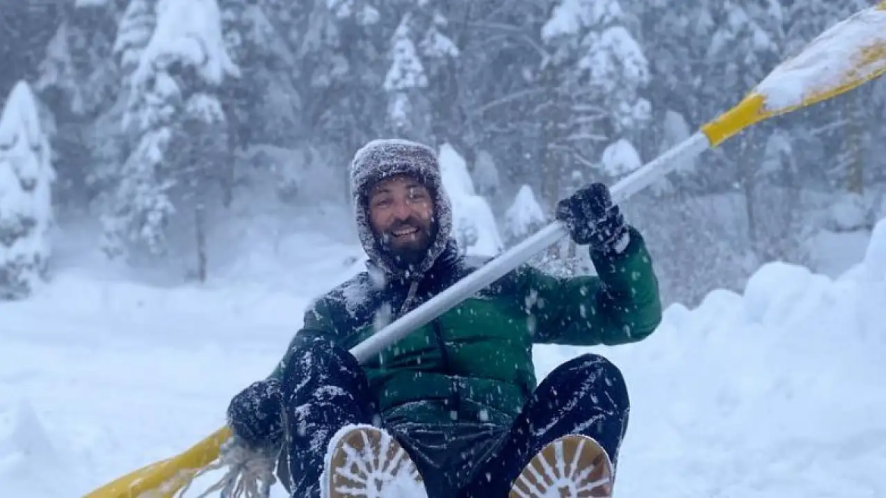 Yoğun kar yağışının ara vermesinin ardından kano ile kayak yaptığını anlatan Karaman, "Bugüne kadar kano ile göllerde birçok aktivite yaptık. Yoğun kar yağışının ardından da kano ile kayma fikri geldi aklıma. Arkadaşımın aracına bağladığım kanoyu çektirerek kar üzerine kano yapmanın heyecanını yaşadım." ifadesini kullandı.