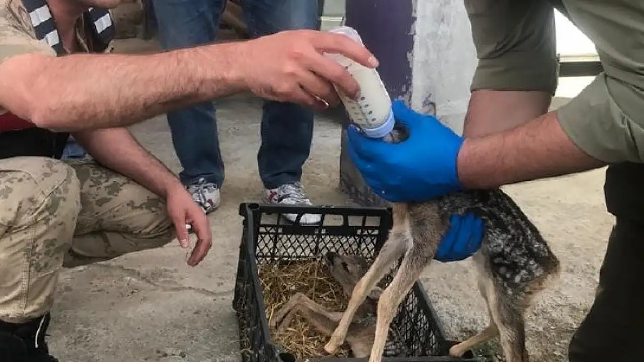 Samsun'da devriye gezen jandarma ekipleri, buldukları 2 karaca yavrusuna şefkat gösterip biberonla beslediler