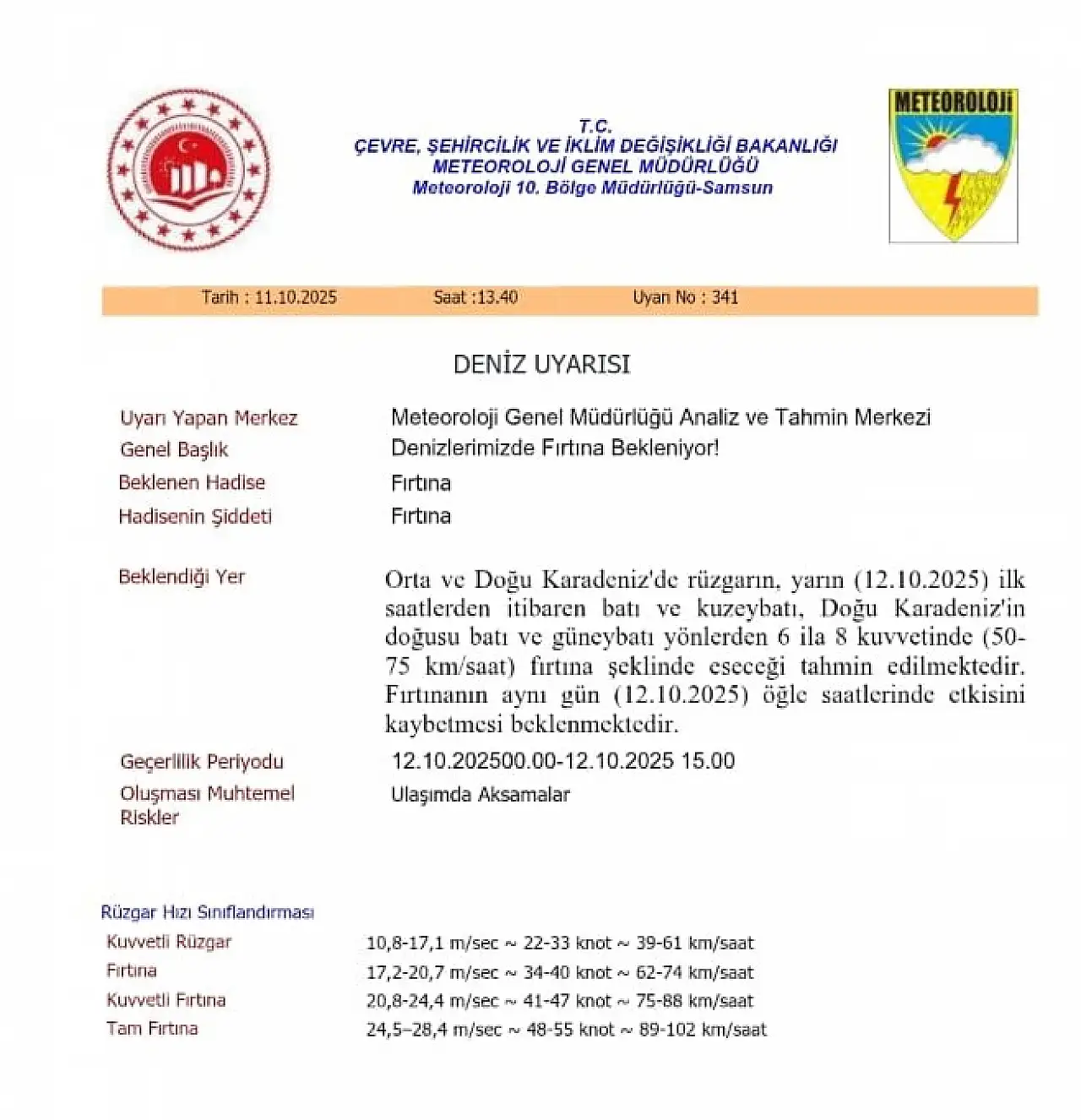 Yapılan açıklamada, rüzgarın 12 Ekim 2025 Pazar günü sabah saatlerinden itibaren batı ve kuzeybatı yönlerinden, Doğu Karadeniz’in doğusunda ise batı ve güneybatı yönlerinden 6 ila 8 kuvvetinde (50-75 km/saat) eseceği ve fırtına şeklinde etkili olacağı bildirildi.