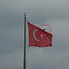 Şiddetli rüzgarda dalgalanan Türk bayrağına konmakta ısrar eden karga, ilginç görüntüler oluşturdu.