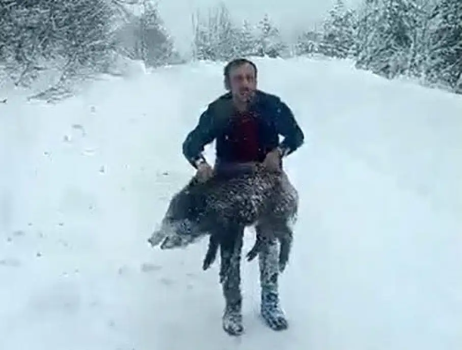 Karlı yolda yaban domuzunu elleriyle yakaladı