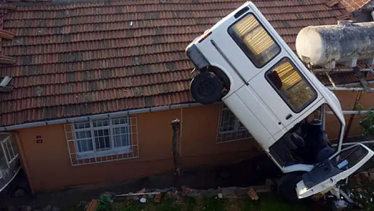 Kartal'da freni tutmayan bir minibüs yokuş aşağı takla atarak tek katlı bir evin üzerine uçtu. Evde kimsenin olmaması büyük bir faciayı önlerken, minibüs sürücüsü kazayı yaralı atlattı