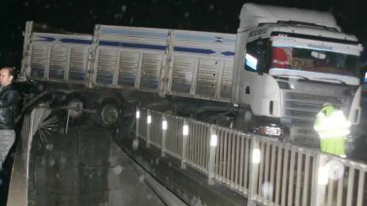 Kaza, İlkadım ilçesi Kıran Mahallesi Yeni Çevre Yolu üst geçidinde saat 17.30 sıralarında meydana geldi. Edinilen bilgiye göre, Fikret Erat (33) idaresindeki 55 K 9710 çekici ve 55 K 9709 dorse plakalı TIR, Ankara istikametine seyir ederken sağanak yağıştan dolayı kayarak üst geçit korkuluklarını parçalayıp askıda kaldı. TIR sürücüsü kazayı yara almadan atlatırken, TIR'ın çekicisinin karşı şeride geçtiği esnada yoldan araç geçmemesi nedeniyle faciadan dönüldü. Kazayla ilgili soruşturma sürdürülüyor. (İHA)