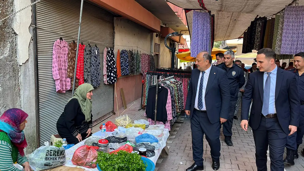 Salı günleri Orta Mahalle'de kurulan halk pazarını gezen Kaymakam Beyazıt ve Başkan Karaca'ya İlçe Jandarma Komutanı Üsteğmen Osman Kula ile İlçe Emniyet Amiri Nevzat Şahin eşlik etti.