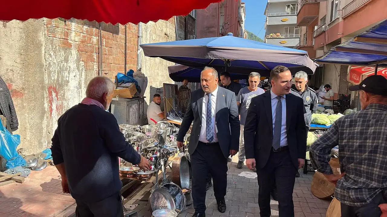 Pazar esnafı ile sohbet eden Beyazıt ve Karaca, vatandaşların taleplerini dinleyip pazarcılara hayırlı işler diledi.