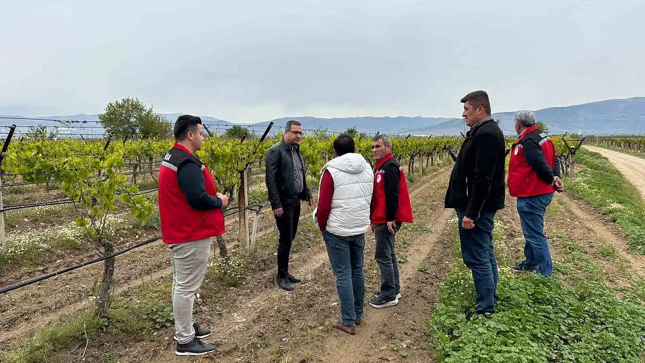 Sarıgöl Kaymakamı Halil Dalak ve Sarıgöl İlçe Tarım ve Orman Müdürü Ahmet Akar ile birlikte don olayından zarar gören bağlarda incelemelerde bulunarak üreticilere geçmiş olsun dileklerini iletti.