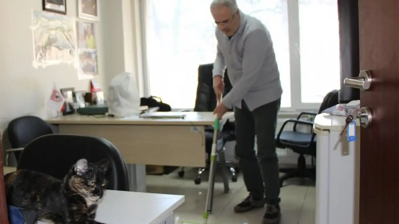 Odanın günlük temizliğini yapıp elleriyle silip süpüren Prof. Dr. Ahmet Dursun, aynı ortamı paylaştığı can dostlarının sürekli girip çıkmalarını da sağlamak amacıyla odasının kapısına aralığını kedileri için ayarladığı asma kilit taktırdı