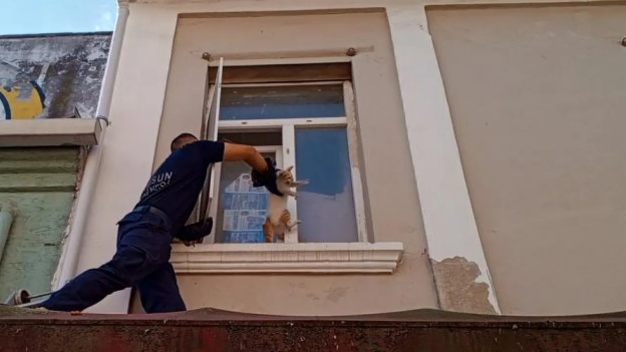 Bafra ilçesinde yarı açık pencerede sıkışan kedi, itfaiye ekipleri tarafından kurtarıldı. Cumhuriyet Meydanı Uncular Geçidi Sokak'ta 2 katlı kullanılmayan binanın 2. katında yarı açık pencerede bir kedinin sıkıştığını gören vatandaşlar, itfaiyeyi arayarak yardım istedi. Olay yerine gelen Büyükşehir Belediyesi itfaiye ekipleri ayağı sıkışan kediyi kurtarmak için çalışma başlattı. Merdivenle kedinin bulunduğu yere çıkan itfaiye eri, kediyi kurtararak aşağı indirdi. Bir kutuya konulan kedi ayağının tedavisi yapılmak üzere götürüldü.