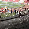 Spor Toto Süper Lig'in 30. haftasında Samsun'da oynanan ve golsüz berabere biten Samsunspor-Gaziantepspor maçının ardından çıkan olaylarda tribünlerdeki koltukları kırarak sahaya atan taraftarlar, yeniden bir araya gelerek tribünleri ve sahayı temizledi.
