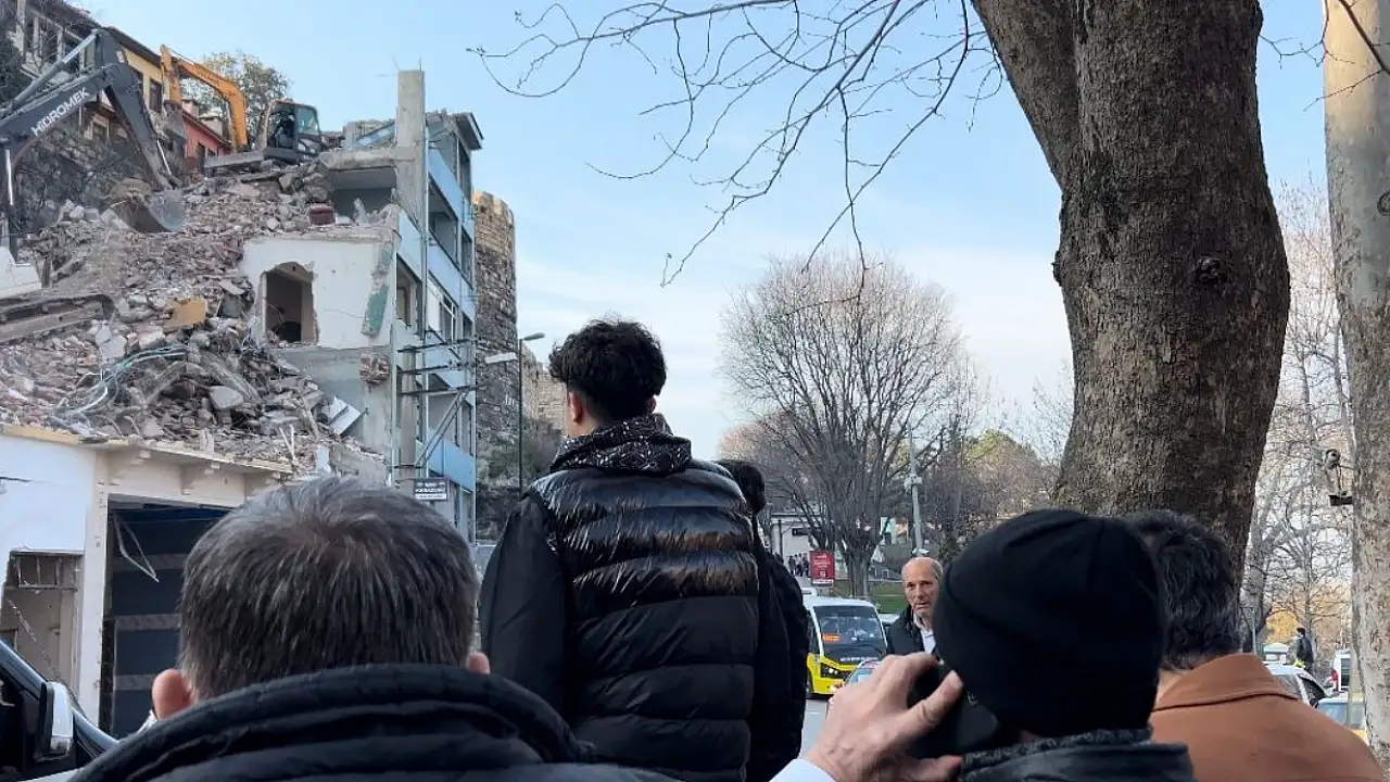 Tophane surlarında toprak kayması nedeniyle yıkımına karar verilen son 5 binanın üzerinde kepçeyi gören vatandaşlar, oruçluyken iftar saatine kadar vakit geçirmek için yıkım çalışmasını film izler gibi izliyor. Vatandaşların pür dikkat çalışmaları takip ettiği anlar ise an be an kameraya yansıdı. Belediye, 3 günlük çalışmayla surların önündeki binaları temizledi.