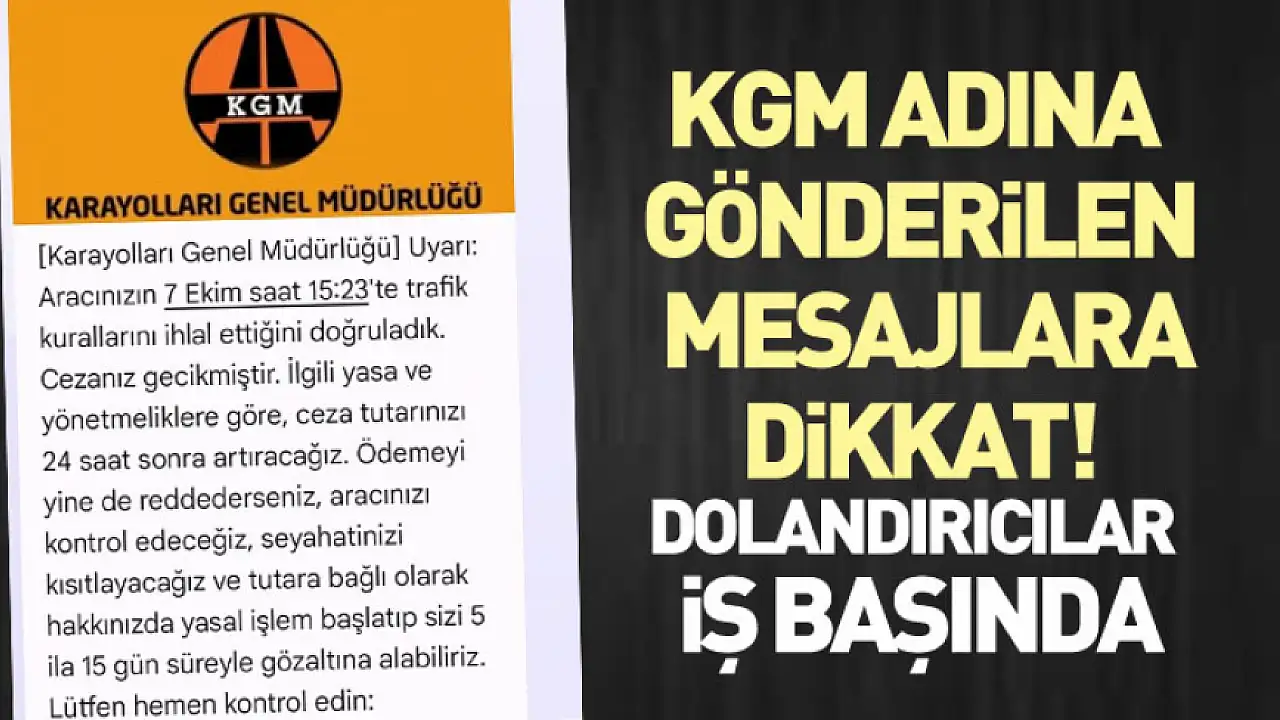 Karayolları Genel Müdürlüğü (KGM) adına gönderilen sahte mesajlar hızla yayılıyor. Söz konusu mesajlarda, “Aracınız trafik kurallarını ihlal etti, cezanız gecikmiştir, 24 saat içinde ödeme yapmazsanız ceza artırılacak veya gözaltına alınabilirsiniz” gibi ifadeler yer alıyor. Mesajın sonunda ise vatandaşlardan, sahte bir bağlantı linkine tıklamaları isteniyor.