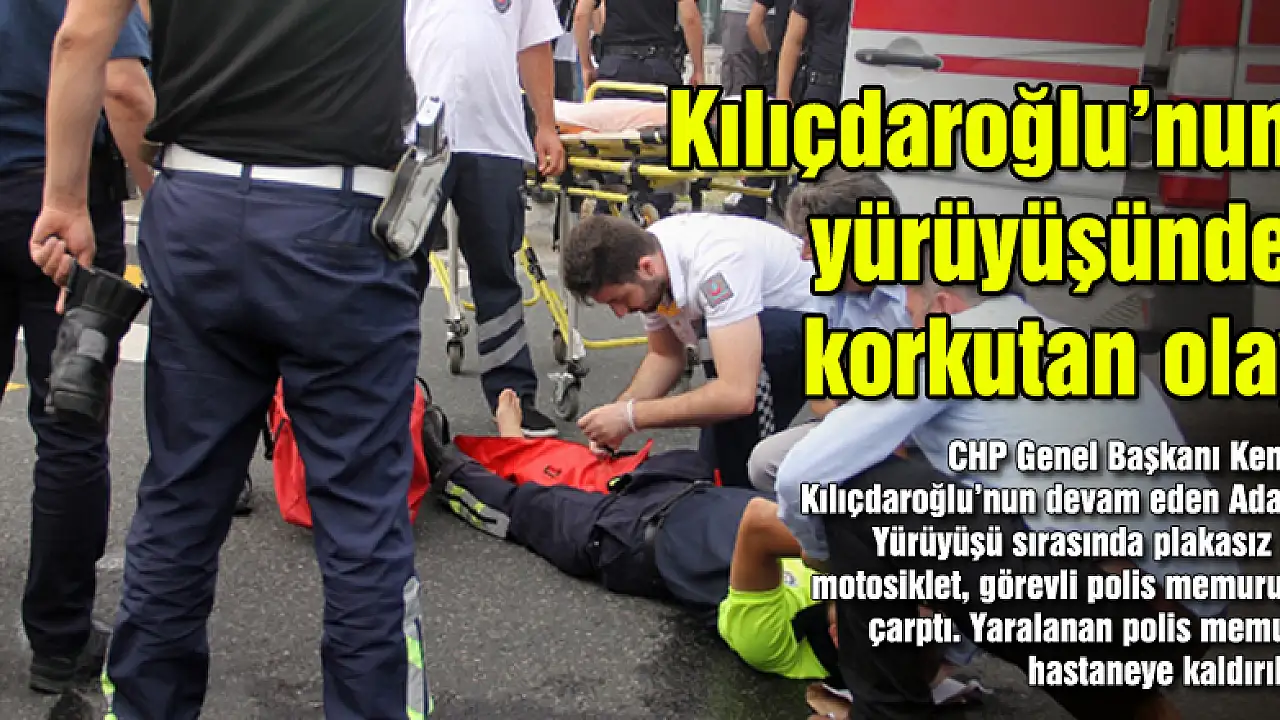 CHP Genel Başkanı Kemal Kılıçdaroğlu'nun devam eden Adalet Yürüyüşü sırasında plakasız bir motosiklet, görevli polis memuruna çarptı. Yaralanan polis memuru hastaneye kaldırıldı.