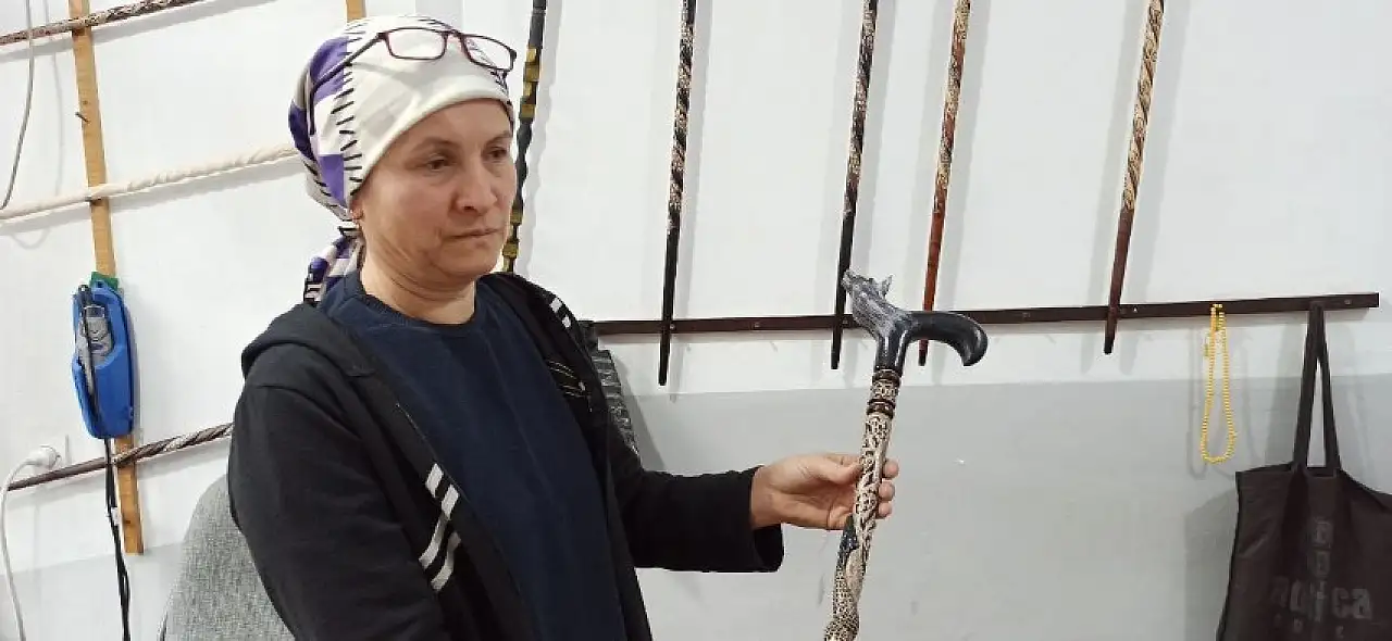 Devrek’te yaşayan Fatma Ayvacı, bir yandan evinin işlerini yaparken diğer yandan atölyede kızılcık ağacına şekil veriyor. 2003 yılından bu yana eşine yardım ederken mesleği öğrenen ve zamanla ustalaşan Ayvacı, kadın elinin değdiği bastonların ayrı bir incelik taşıdığını ifade etti.