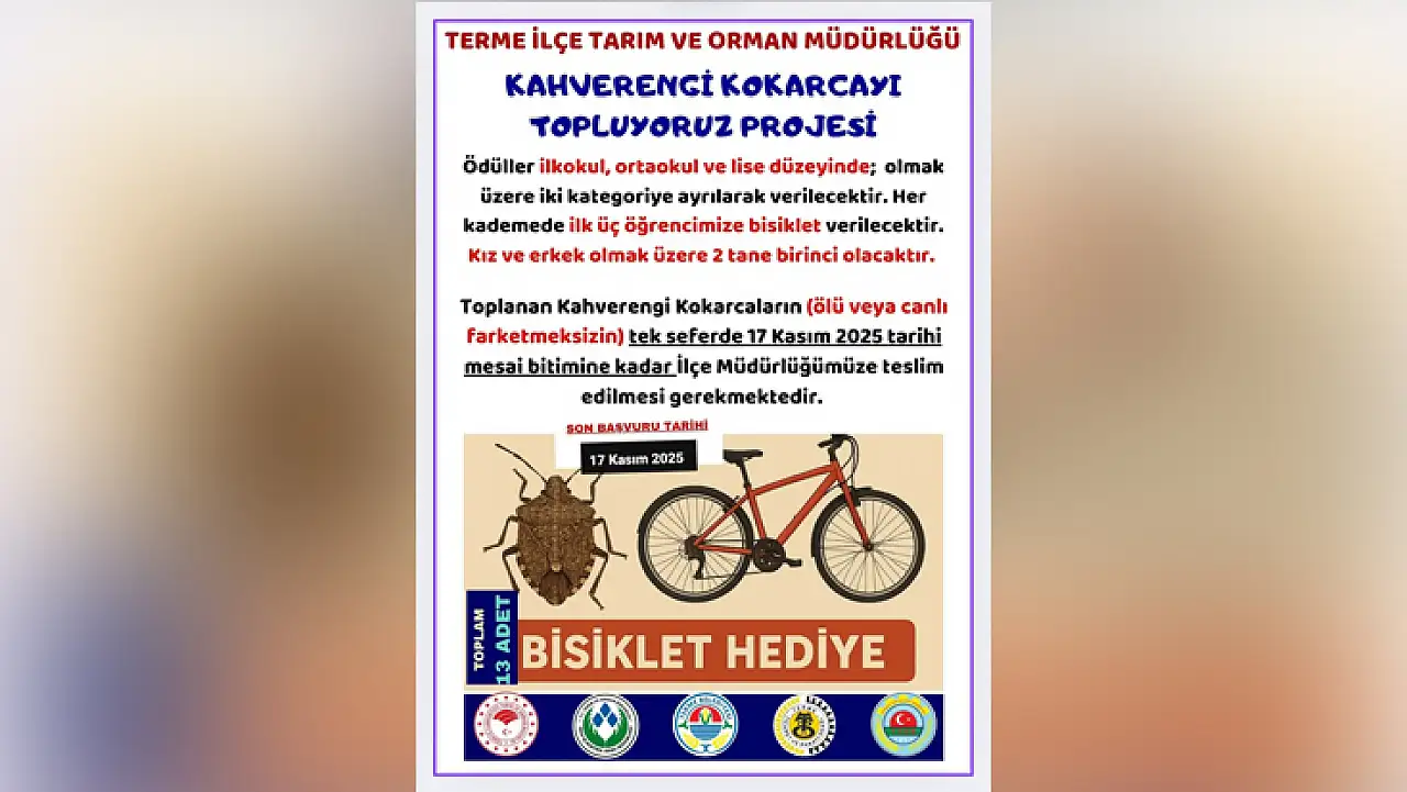 Terme İlçe Tarım ve Orman Müdürlüğü tarafından yürütülen 'Kahverengi Kokarcayı Topluyoruz' projesiyle, ilkokul, ortaokul ve lise düzeyindeki öğrenciler arasında düzenlenen yarışmada, en fazla kahverengi kokarca toplayan öğrencilere bisiklet hediye edilecek.