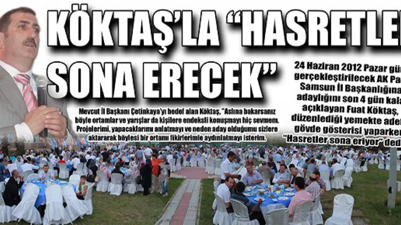 24 Haziran 2012 Pazar günü gerçekleştirilecek AK Parti Samsun İl Başkanlığına adaylığını son 4 gün kala açıklayan Fuat Köktaş, düzenlediği yemekte adeta gövde gösterisi yaparken “Hasretler sona eriyor” dedirtti