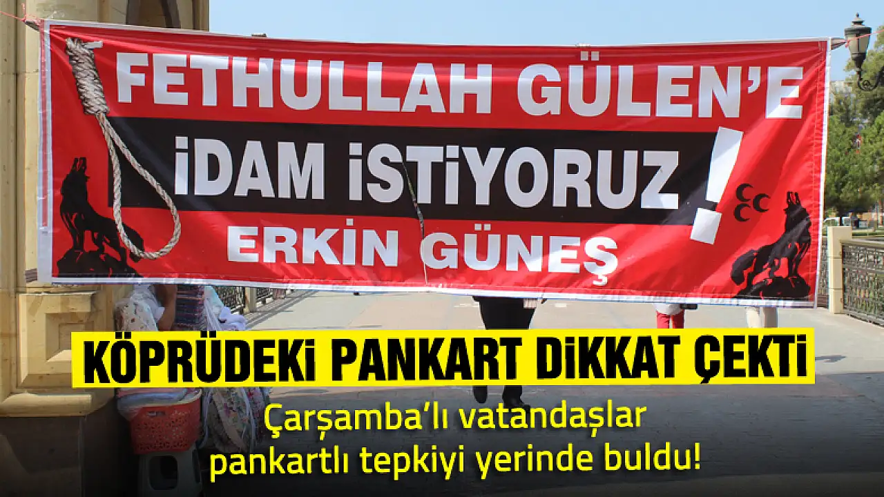 Çarşamba İlçesi Tarihi Köprü üzerinde bugün sabah saatlerinden itibaren asılı vaziyette bulunan pankart vatandaşların dikkatini çekti. Asılan pankartta 15 Temmuz Darbe Girişimi’nde bulunan Fetullahçı Terör Örgütü (FETÖ) lideri Fethullah Gülen’ için idam istenildiği yazılıydı.