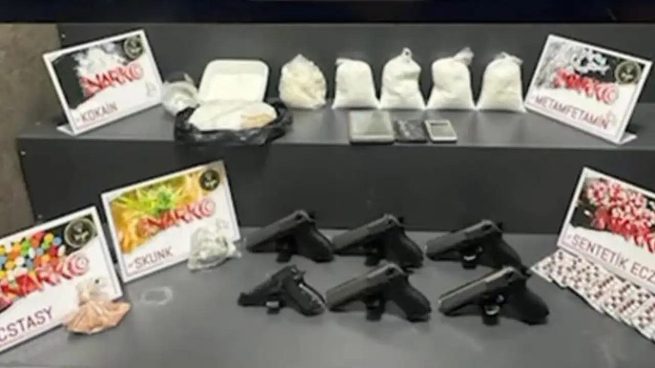 Konak İlçe Emniyet Müdürlüğüne bağlı Suç Önleme ve Soruşturma Büro Amirliği ekipleri, bir evde uyuşturucu madde ticareti yapıldığı bilgisi üzerine harekete geçti. Savcılık talimatıyla adreste yapılan aramada, evin müştemilat ve kümesine gizlenmiş halde, 2 kilo 365 gram metamfetamin, 542 gram taş kokain, 286 gram toz kokain, 40 gram toz halinde extacy, 16 gram esrar ve 111 sentetik hap ile 2 hassas terazi ve 6 ruhsatsız tabanca ele geçirildi.