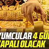 4 gün kapalı olan Kuyumcular, 15 Nisan 2024 Pazartesi gününden itibaren açık olacak. Çarşamba Kuyumcular Derneğinden yapılan duyuruda; “Ramazan Bayramı dolayısıyla kuyumcu dükkânlarımız, 10 Nisan Çarşamba, 11 Nisan Perşembe, 12 Nisan Cuma ve 13 Nisan Cumartesi günü kapalı olacaktır. 15 Nisan 2024 Pazartesi günü iş yerlerimizin açık olacağı halkımıza ilanen duyurulur” ifadeleri kullanıldı