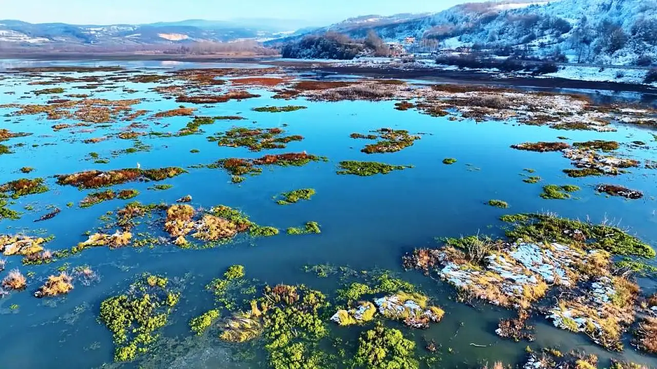 Samsun'da bulunan Ladik Gölü, kar yağışının etkisiyle adeta beyaz gelinliğini giydi. Gölün eşsiz güzelliği, havadan çekilen görüntülerle daha net şekilde ortaya çıktı.