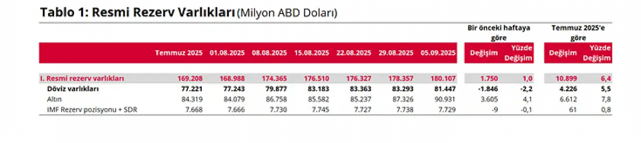 5 Eylül haftası itibarıyla brüt döviz rezervleri 1 milyar 855 milyon dolarlık düşüşle 91 milyar 31 milyon dolardan 89 milyar 176 milyon dolara geriledi. Aynı dönemde altın rezervleri ise 87 milyar 326 milyon dolardan 90 milyar 931 milyon dolara çıkarak 3 milyar 605 milyon dolar artış kaydetti. Bu gelişmelerin ardından TCMB’nin toplam rezervleri 178 milyar 357 milyon dolardan 180 milyar 107 milyon dolara yükselerek tüm zamanların en yüksek seviyesine ulaştı.